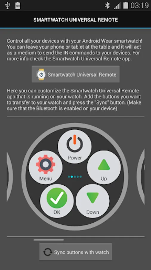 This app is an extension of the Galaxy Universal Remote which will have to be installed on your phone or tablet to send the IR commands to your devices. You can leave your phone at the table and control your devices directly through your watch.