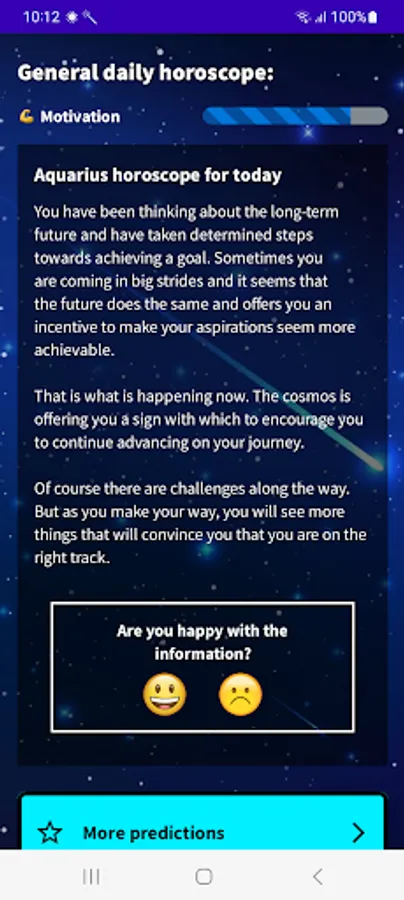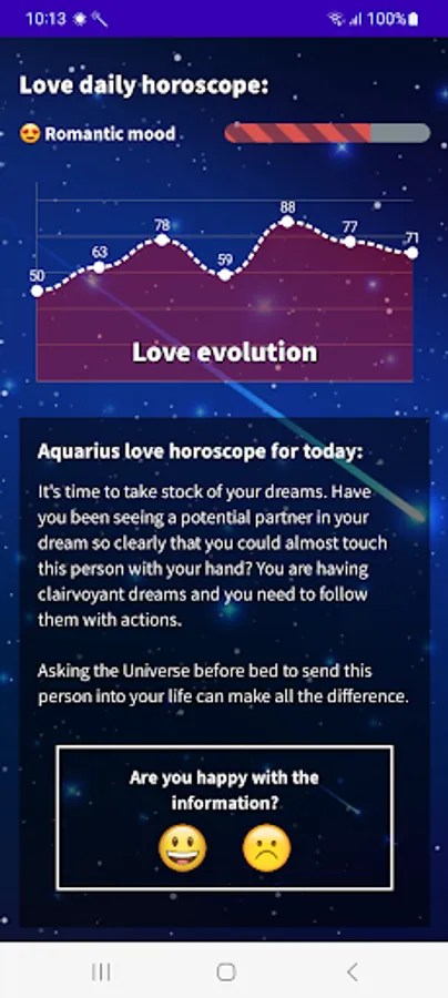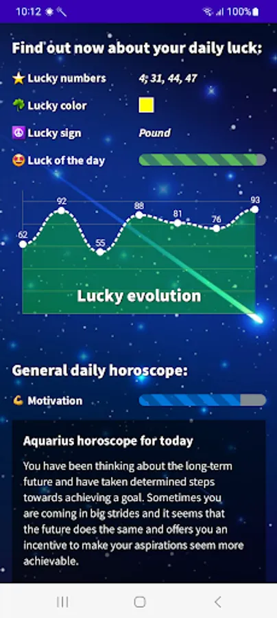 In addition, our 2023 horoscope app will provide you with daily motivation to help you achieve your goals and a romantic mood so you know how your love life will evolve, all in perfect English for Aquarius. We will also provide you with a financial state of mind and an estimated evolution of the financial state so that you know what your financial fortune will be like.