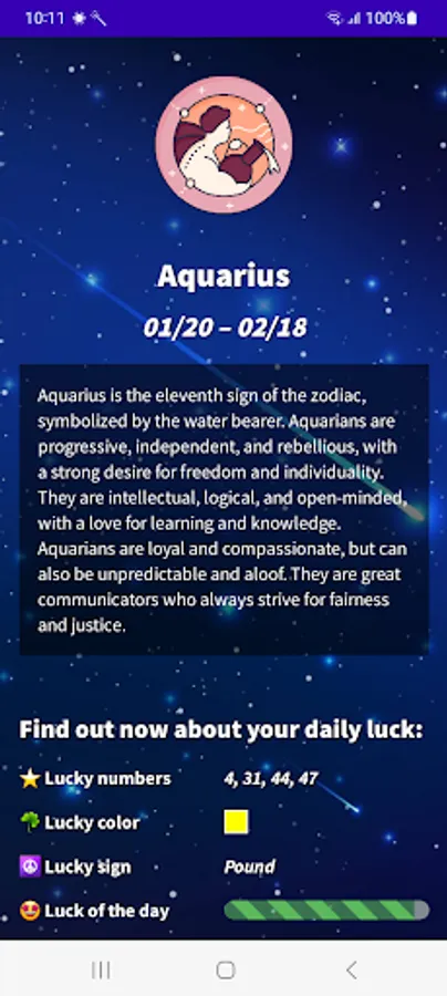 Welcome to our free daily, weekly and monthly horoscope app for Aquarius zodiac sign! In this app in English, you will find all the astrological information you need to plan your day, week or month in advance. Pure motivation for the Aquarius sign in 2023. What will happen to love and destiny?