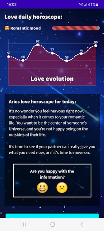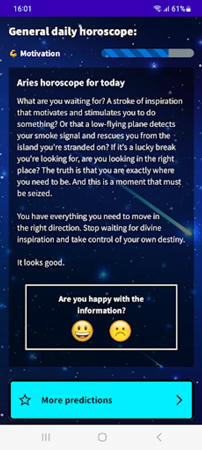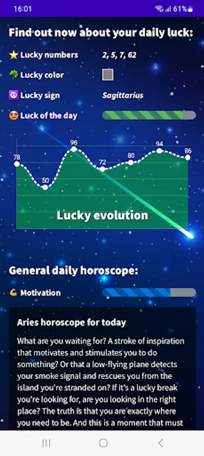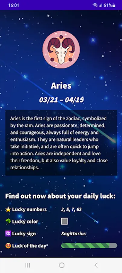 Find out what your day will be like with our Aries 2023 Daily Horoscope app! Download our free app in English from Google Play and get access to all the astrological information you need to plan your day in advance. With our app, you will know your lucky number, lucky color, lucky sign, evolution of your fortune, daily motivation, romantic and financial mood. Do not wait any longer! Download our free Aries horoscope app and start enjoying all its advantages.