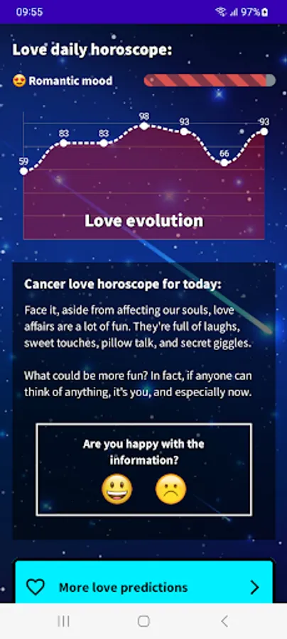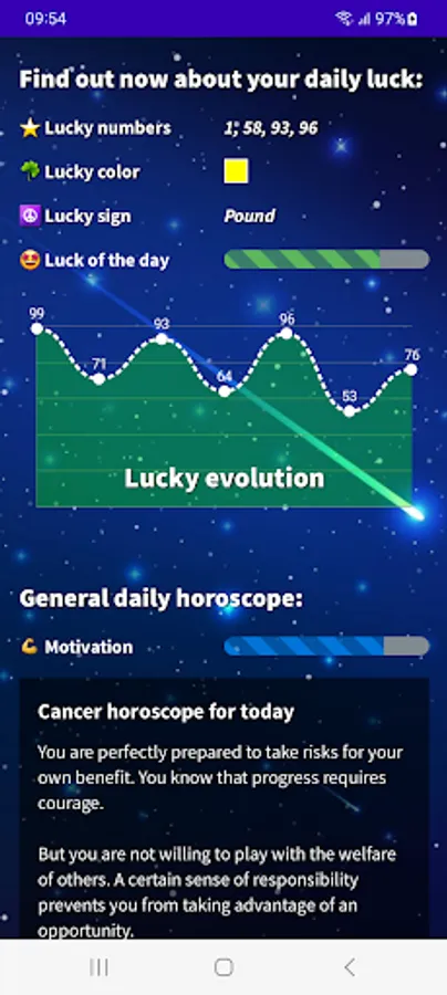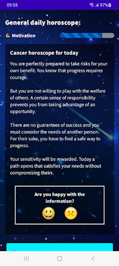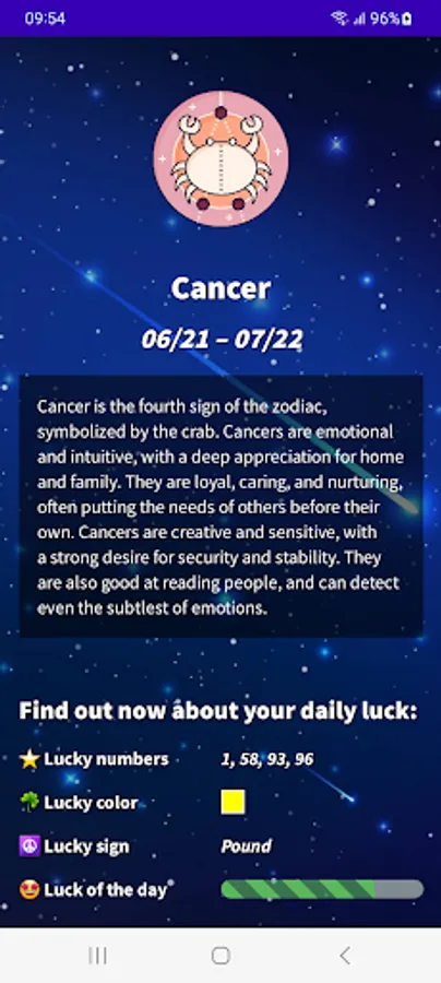 Find out what your day will be like with our Cancer 2023 Daily Horoscope app! Download our free app from Google Play and get access to all the astrological information you need to plan your day in advance. With our app, you will know your lucky number, lucky color, lucky sign, evolution of your fortune, daily motivation, romantic and financial mood. Do not wait any longer! Download our free Cancer horoscope app and start enjoying all its advantages.