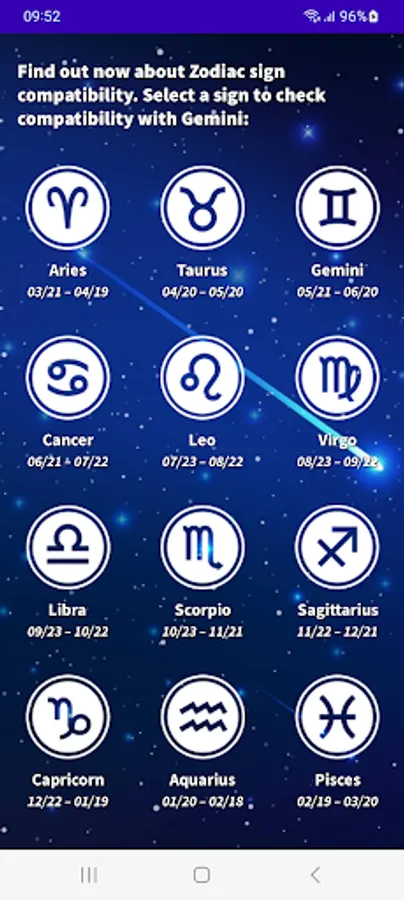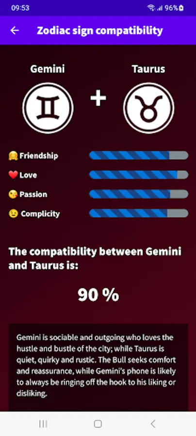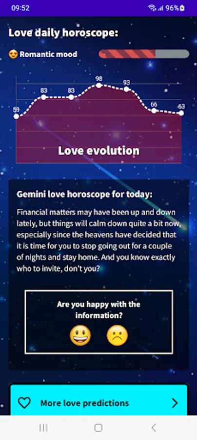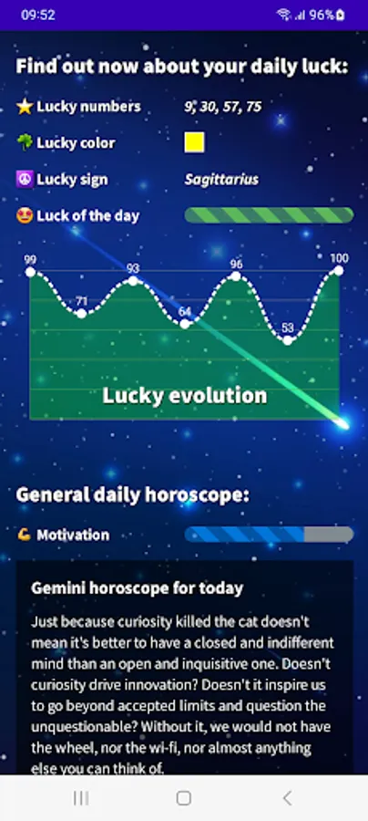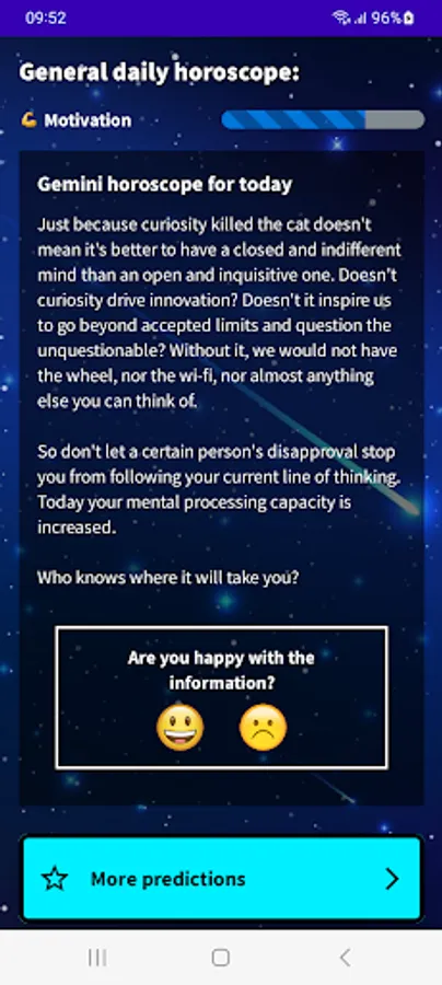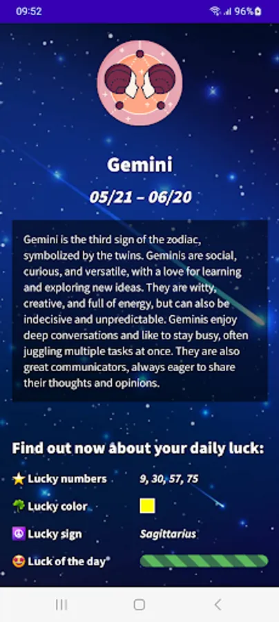 Find out what your day will be like with our Gemini 2023 Daily Horoscope app! Download our free app in English from Google Play and get access to all the astrological information you need to plan your day in advance. With our app, you will know your lucky number, lucky color, lucky sign, evolution of your fortune, daily motivation, romantic and financial mood. Do not wait any longer! Download our free Gemini horoscope app and start enjoying all its advantages.