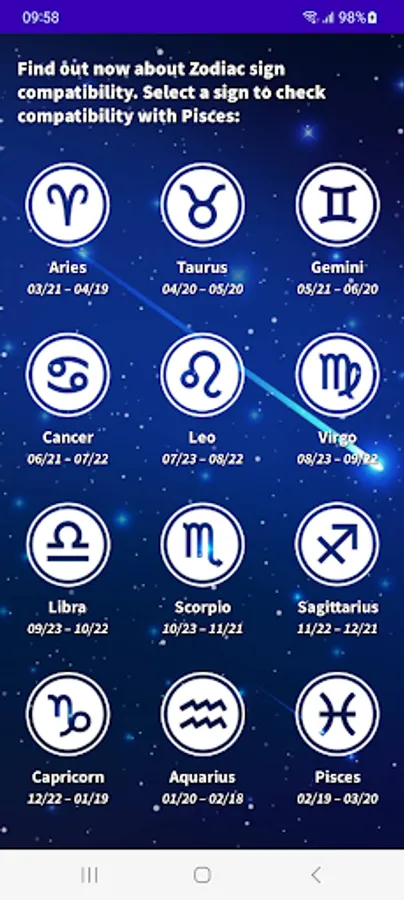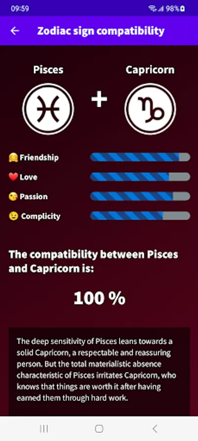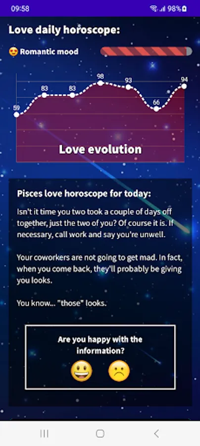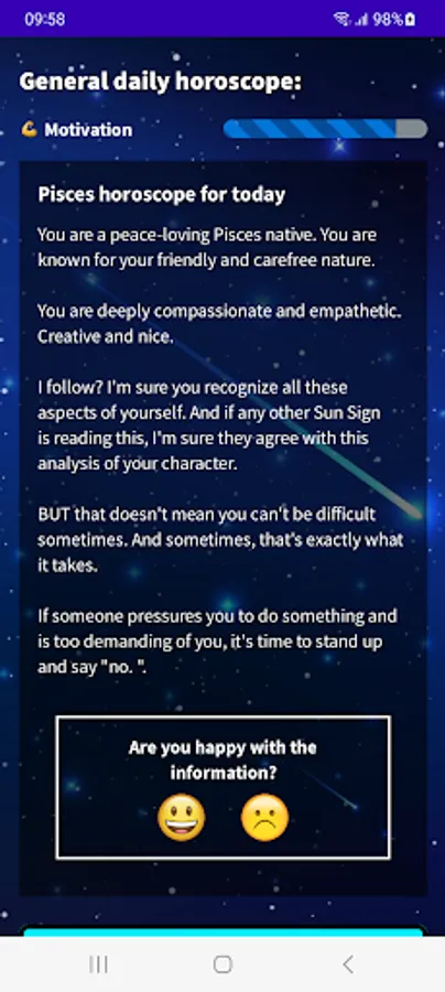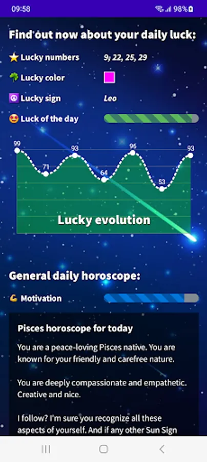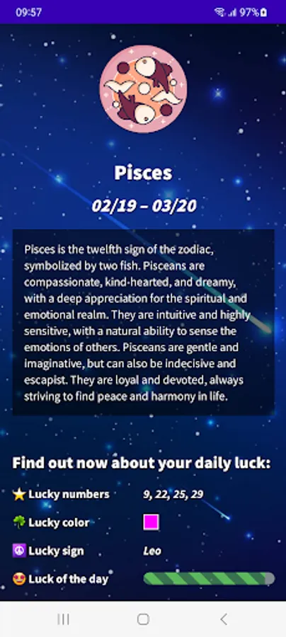 Find out what your day will be like with our Pisces 2023 Daily Horoscope app! Download our free app in English from Google Play and get access to all the astrological information you need to plan your day in advance. With our app, you will know your lucky number, lucky color, lucky sign, evolution of your fortune, daily motivation, romantic and financial mood. Do not wait any longer! Download our free Pisces horoscope app and start enjoying all its advantages.