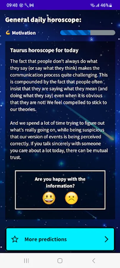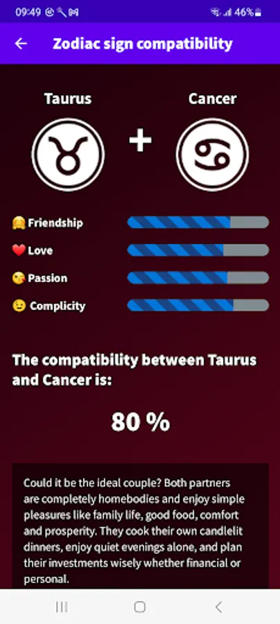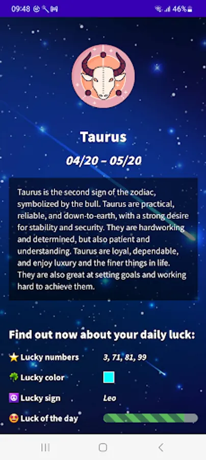 Taurus, as you may know, is the second astrological sign in the zodiac, represented by the bull symbol full of power. People born under this sign are known for their strong will, determination, and practicality. They value stability, comfort, and material security, and are hard workers who enjoy the fruits of their labor. Taureans can be stubborn and resistant to change, but they are also warm, affectionate, and sensual, with a love for all the pleasures of life. If you are a taurean, this horoscope free app is for you.