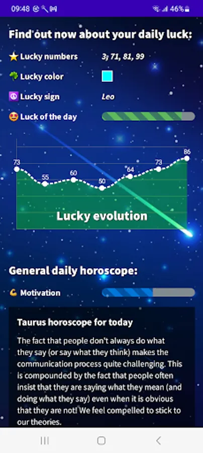Find out what your day will be like with our Taurus 2023 Daily Horoscope app! Download our free app in English from Google Play and get access to all the astrological information you need to plan your day in advance. With our app, you will know your lucky number, lucky color, lucky sign, evolution of your fortune, daily motivation, romantic and financial mood. Do not wait any longer! Download our free astrology Taurus horoscope app and start enjoying all its advantages.