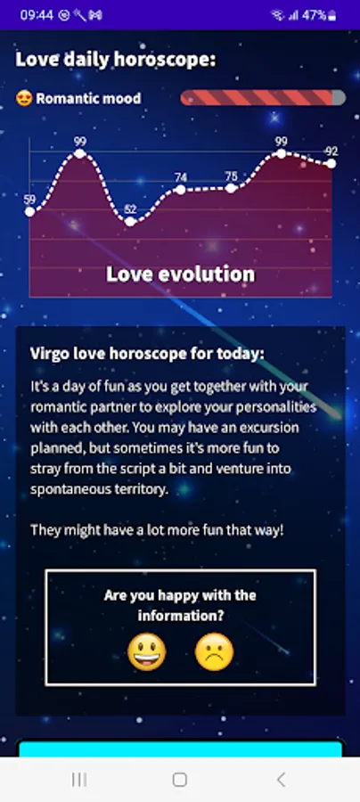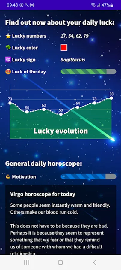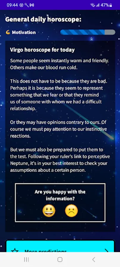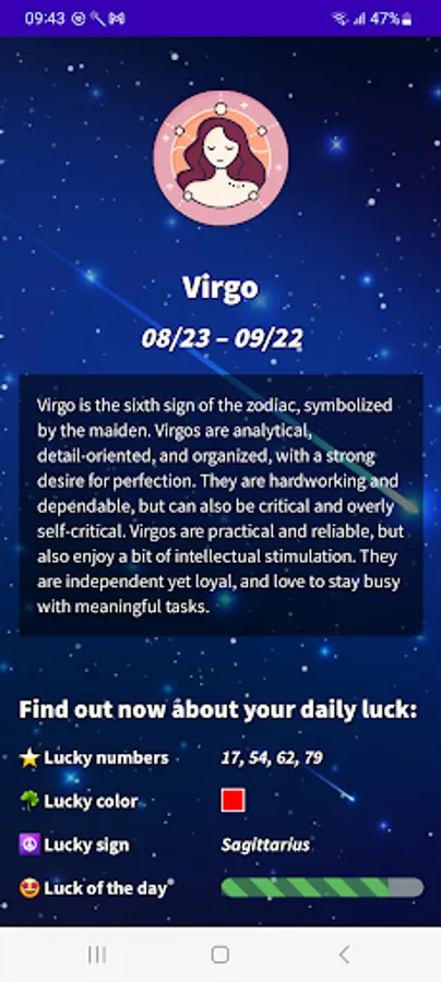 Find out what your day will be like with our Virgo 2023 Daily Horoscope app! Download our free app in English from Google Play and get access to all the astrological information you need to plan your day in advance. With our app, you will know your lucky number, lucky color, lucky sign, evolution of your fortune, daily motivation, romantic and financial mood. Do not wait any longer! Download our free astrology Virgo horoscope app and start enjoying all its advantages.