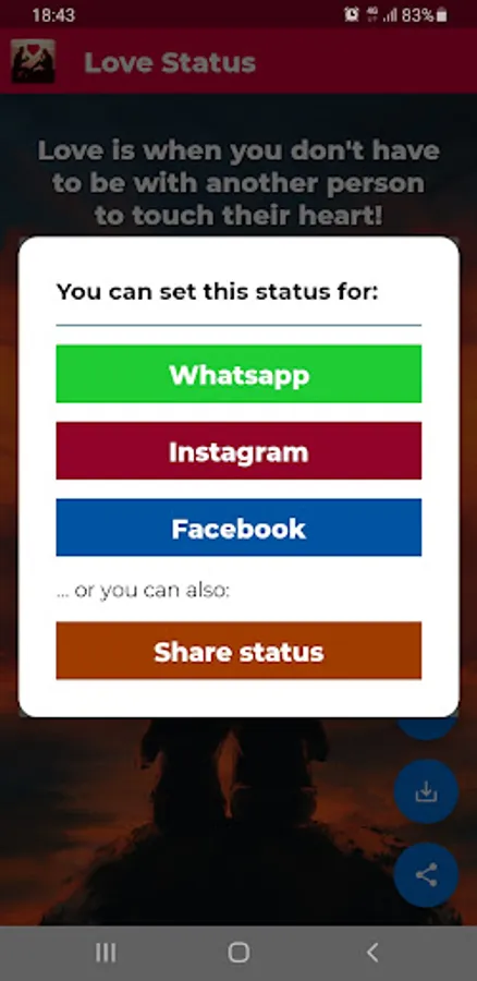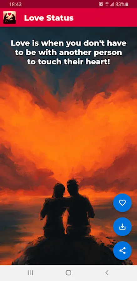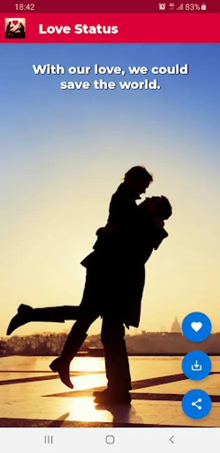 Download now Love Status - Romantic Quotes free app and prove that love you have inside. Celebrate Valentine’s Day like never before and try to get the attention of that special person on Instagram, WhatsApp, etc. If you broke up recently you will also find Hindi sad status that will help you to find motivation.