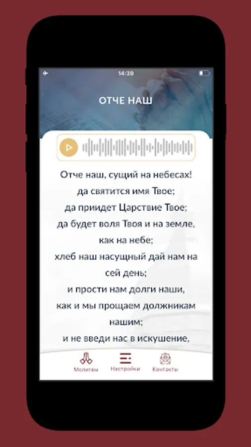 In the application “Prayer Book” you can listen to Christian music, which will also serve as support and comfort for you. All materials of the application are available in Russian, Ukrainian and English. In the application, you can choose for reading a font size that is convenient for you.