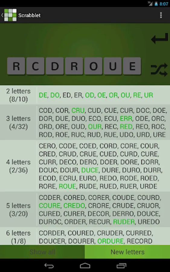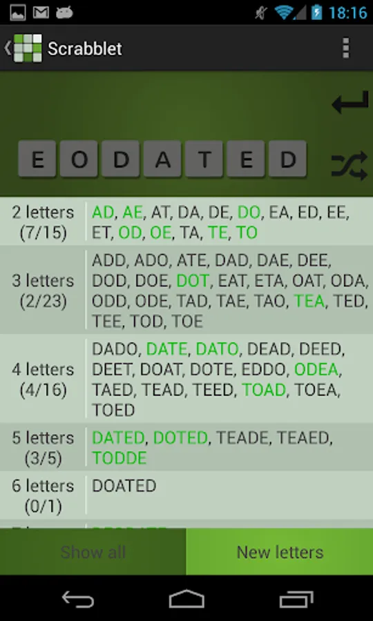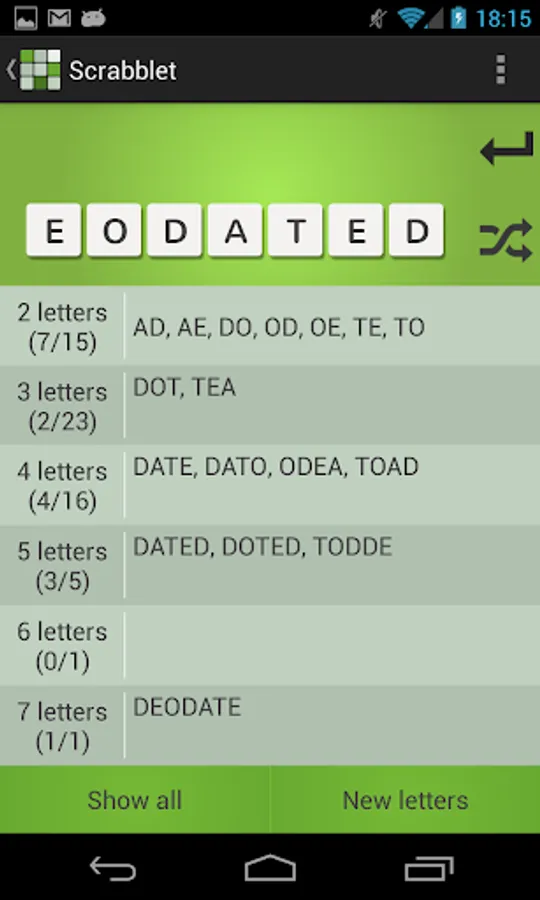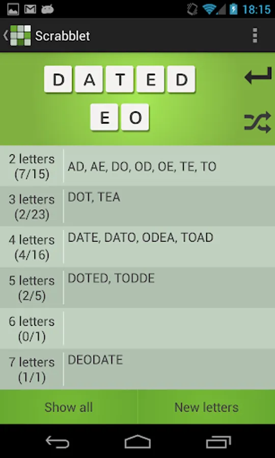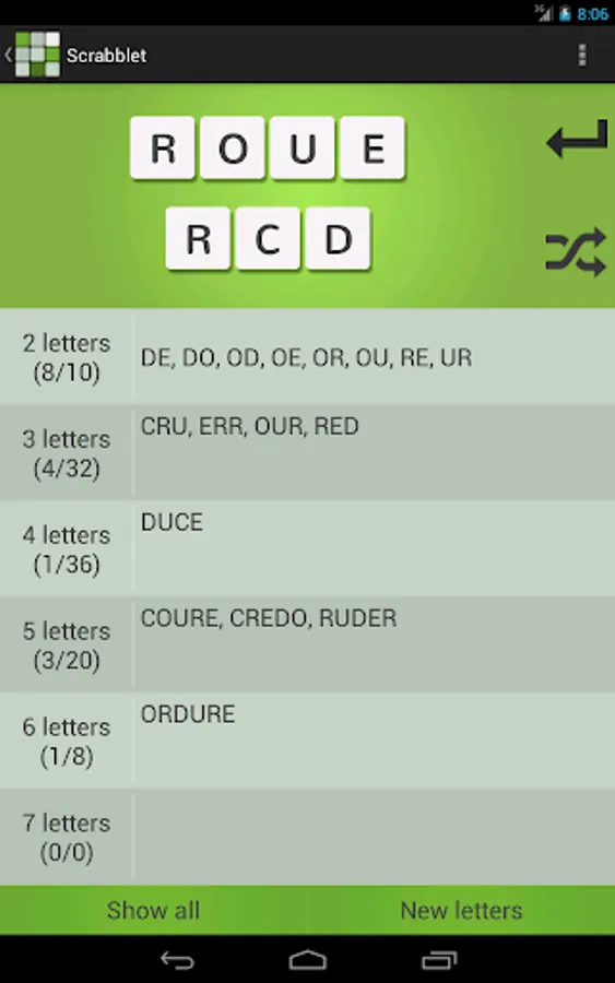 Scrablet is a fun word game designed to improve your ability at Scrabble and similar games. From a rack of seven letters, try to create all the words that can be made according to the standard Scrabble SOWPODS dictionary.