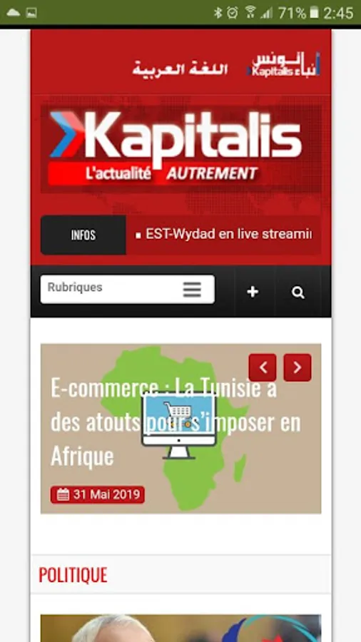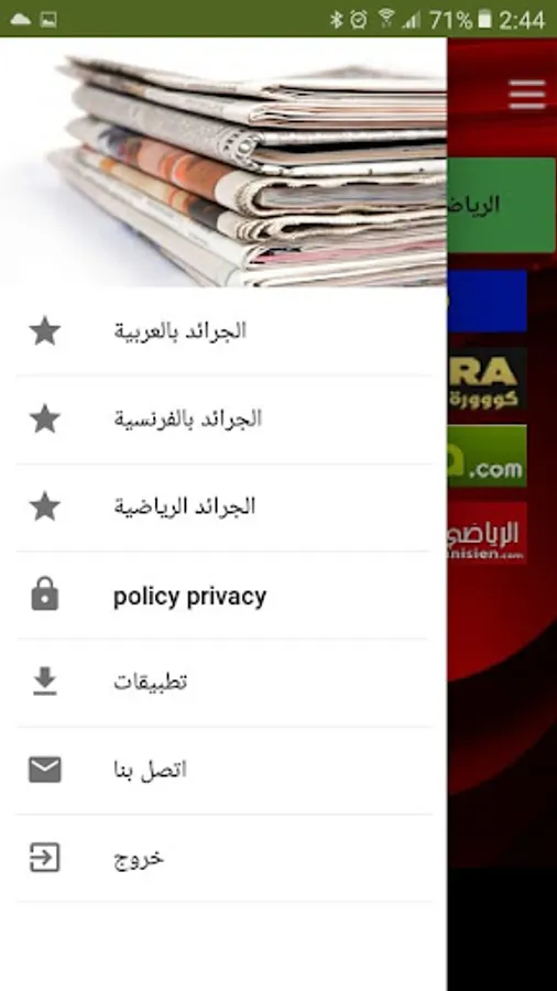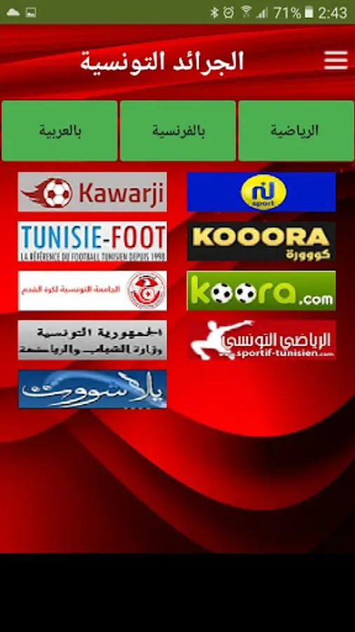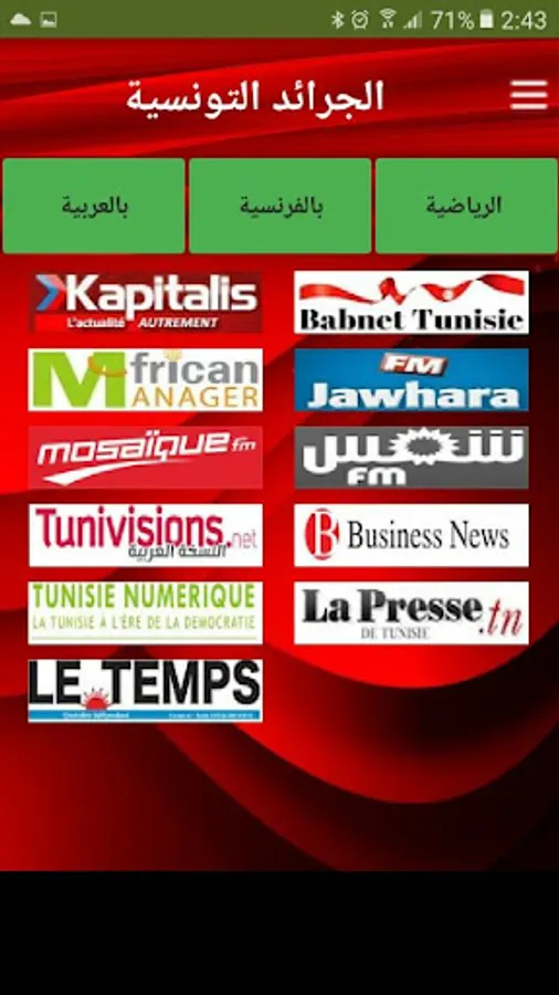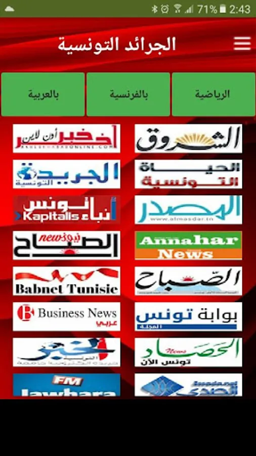 In the application of Tunisian newspapers, international news, local news, Tunisia shrapnel, latest political developments, ... Riyadis news (football, basketball, handball, boxing, ...)