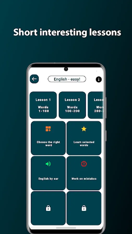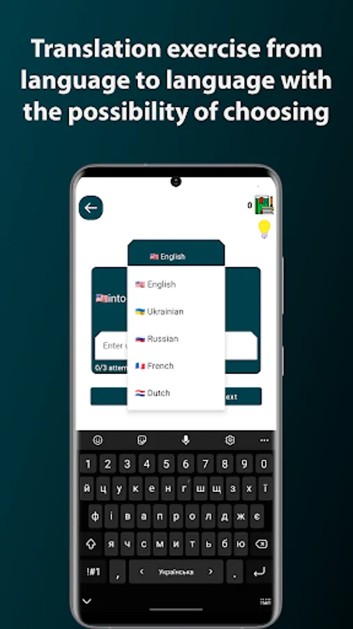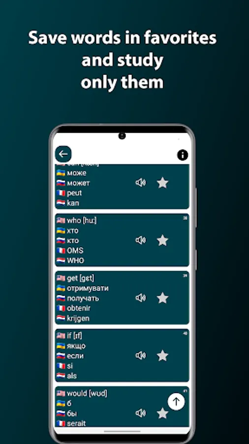 Our application provides several ways to learn words. You can study selected words, take a lesson where you have to choose the correct word from four possible answers, practice English by ear, where you hear the word and write it in the field, and work on the mistakes. In addition, our application has 10 lessons, each of which consists of 100 words. An English word comes up and you need to translate it into Ukrainian, Russian, French, Dutch or vice versa. These lessons will help you consolidate what you have learned and use it confidently in real life.