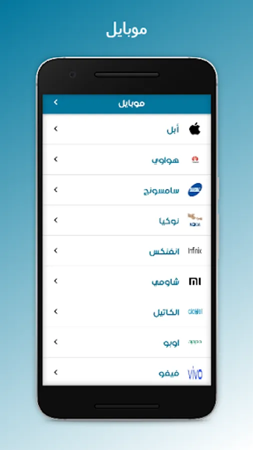 القسم الاول : الموبايل ويتضمن 9 نوع للموبايل apple - Huawei -Samsung- Nokia - Infinix - Xiaomi - Alcatel - Oppo - Vivo