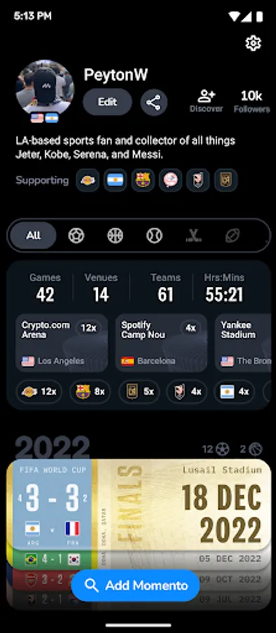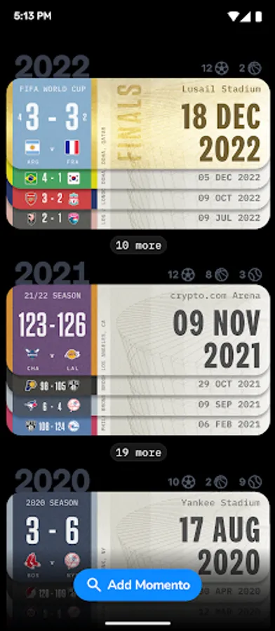 Momento is the best way to track the games you attend live, share your sports history with friends, and celebrate the top moments you’ve witnessed in person.
