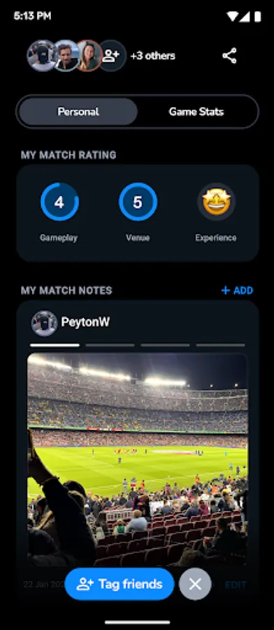 Momentos are dynamic—tag who you went to the game with, rate the experience in the venue, and add photos and notes from your perspective.