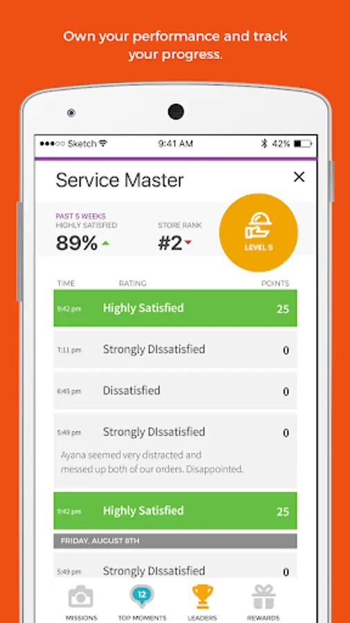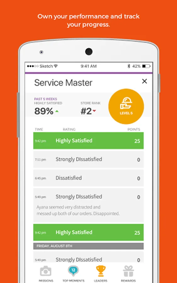 ShiftOne puts your performance data directly in your palm. A simple tap lets you view customer ratings, access comments, and see how you stack up against coworkers across your region.
