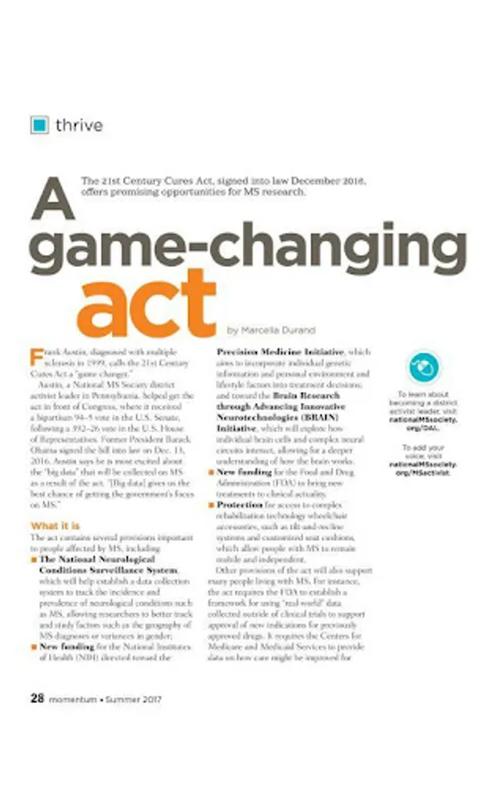 Momentum, the flagship magazine of the National MS Society, is the largest MS-related publication in the world. The quarterly magazine includes stories by and about people living with MS, expert opinion from MS specialists, and reports on current events, MS advocacy and advances in MS research.