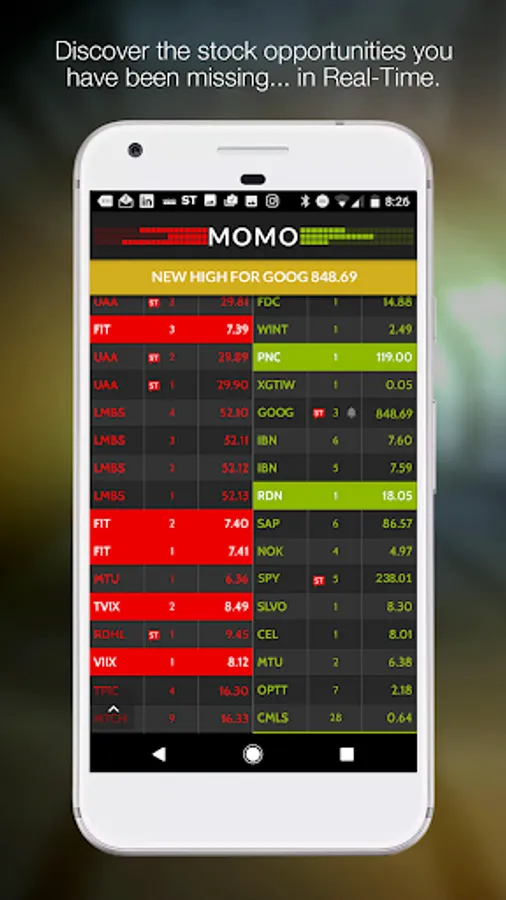 MOMO is a stock trading tool that streams new daily high and low breakouts in real-time. MOMO only does this one valuable thing and does what is unavailable on any other stock market app. With MOMO you can uncover breakouts on over 7500 US stocks as well as protect investments with integrated alert notifications.