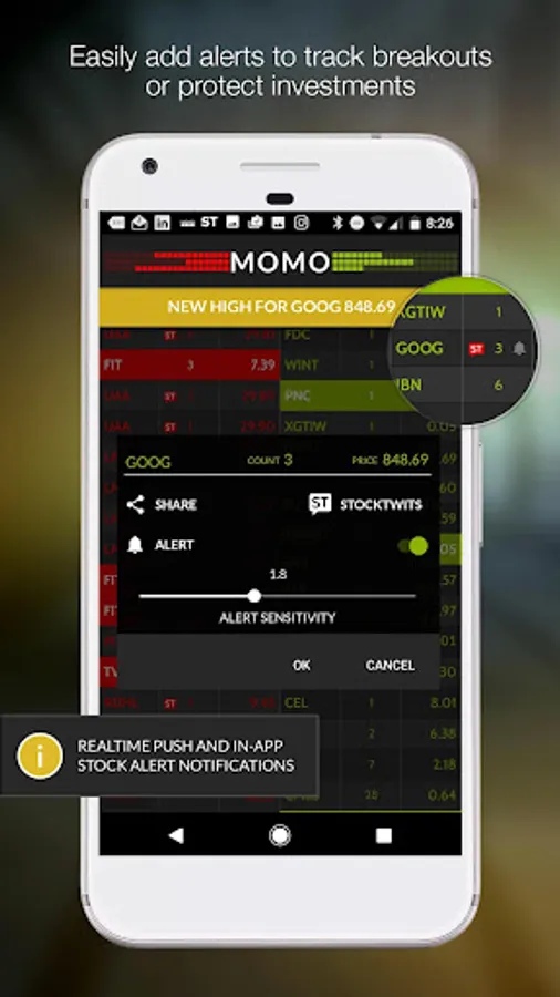 Stock Alerts - Want to monitor a stock for a break out? We've created the easiest way to set alerts in all of finance. Features include push notification integration and alert sensitivity.