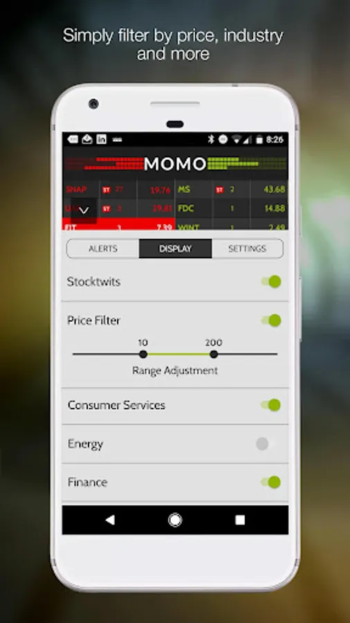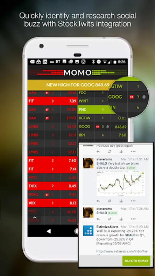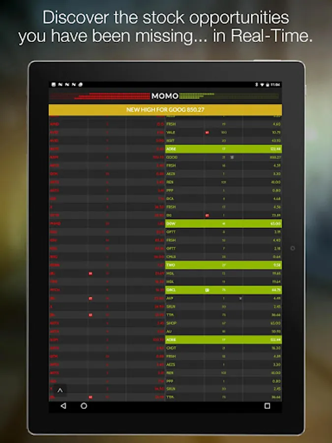 Missing out on that biotech stock launching into the stratosphere? Looking for after-hours action during earnings season? Or are you simply tired learning of stocks making huge moves hours after they happen? Professional traders have used desktop tools like MOMO for years and now we are happy to bring MOMO to Android so now everyone can uncover new stock opportunities as they happen.