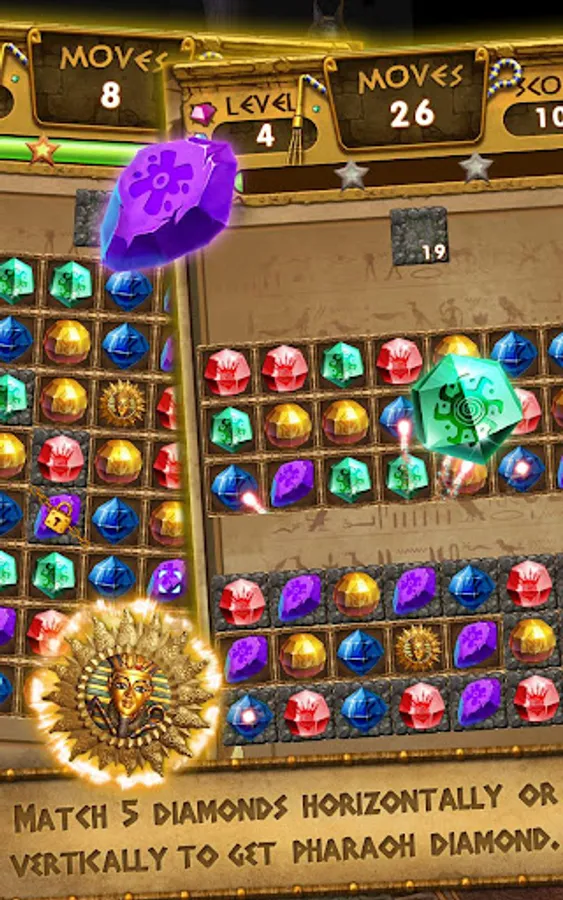 - Match 5 diamonds horizontally or vertically to generate pharaoh diamond.