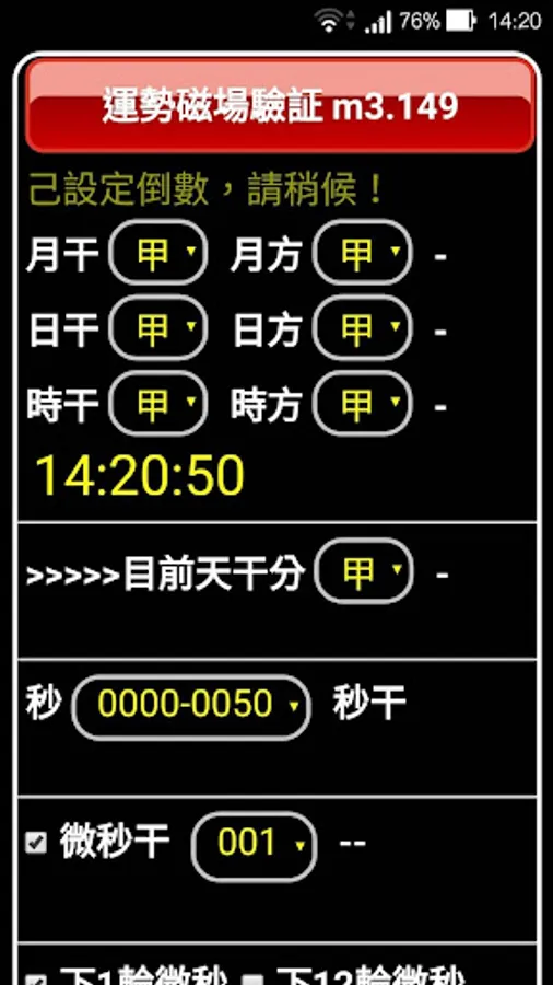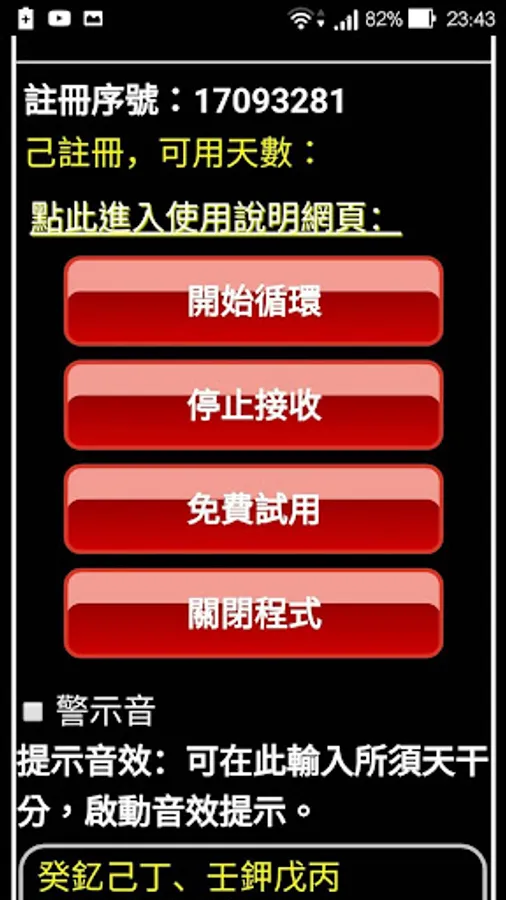 10:警示音功能:在自己所要的天干分出現時,勾選會有警示音。預設為辛、釔,可自己修改為自己須要的。