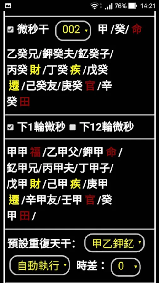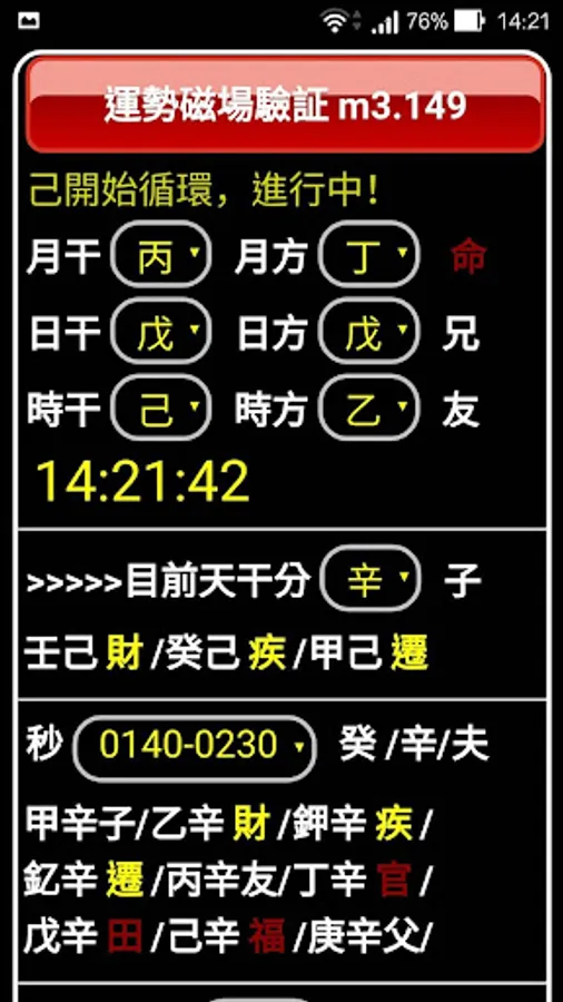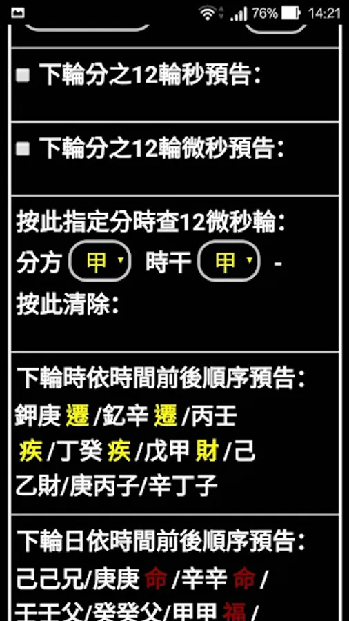 2:程式的最右側會出現命兄夫子財疾遷友官田福父等文字,計算出對您目前最有利的時辰,有月、日、時、分、秒、微秒。本頁最下方有較詳細的文字說明。