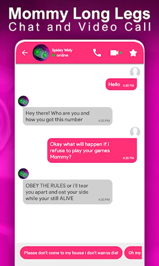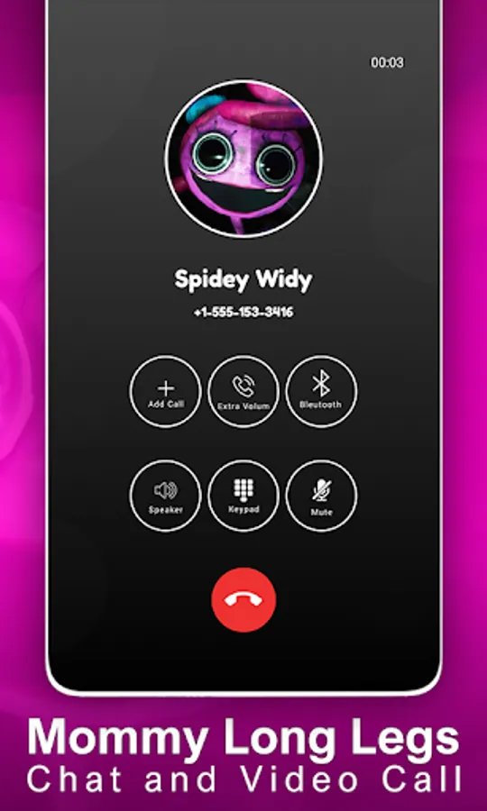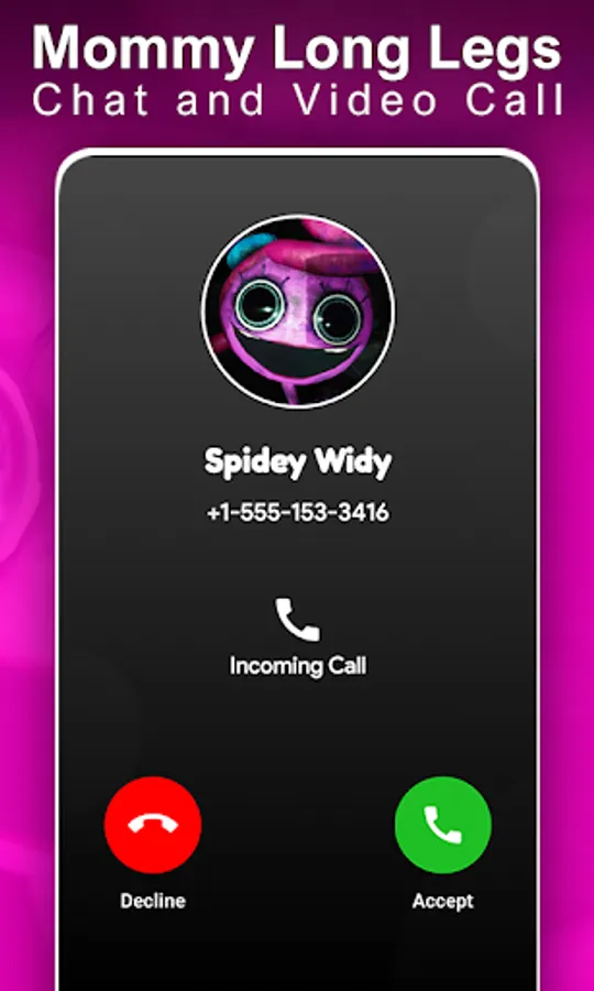 Mommy long legs fake video call. Very funny application with scary Mommy Long legs from famous game poppy from FNF. fake video call. Get Video Call and Voice Call from Huggy Wuggy friend Mommy Long legs.