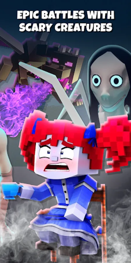 Scary creatures appear in the cubic world with which you have to fight. Here you will encounter SCP monsters, horror game characters, and even an evil clown. You definitely need an upgraded weapon set with a sharp sword, battle axe, and a well-aimed bow. Trust your skills and easily emerge victorious from the most brutal battles.