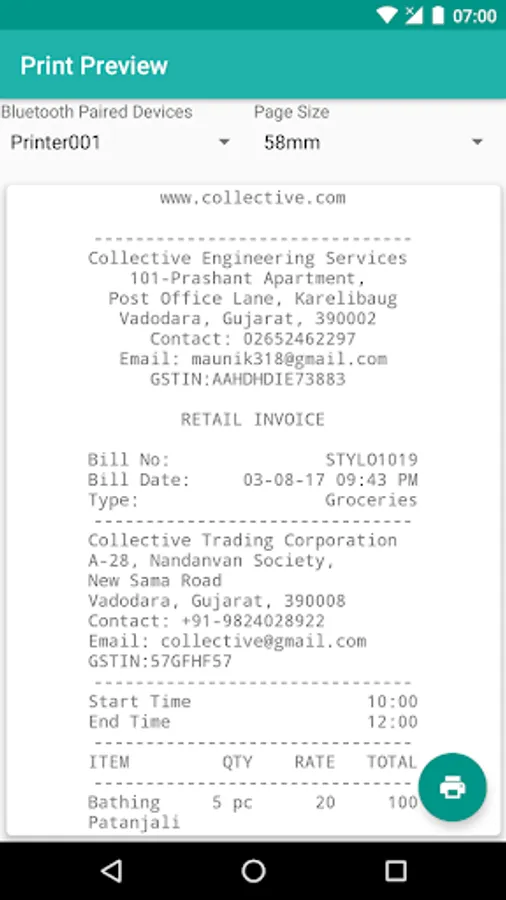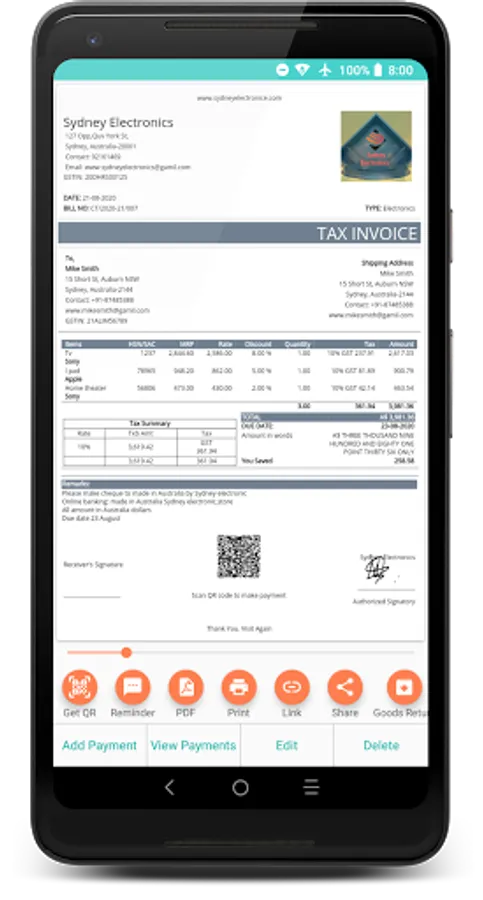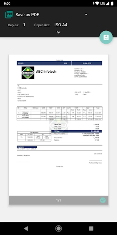 • Print to Wifi Printer. Generate PDF of Invoice from mobile.
