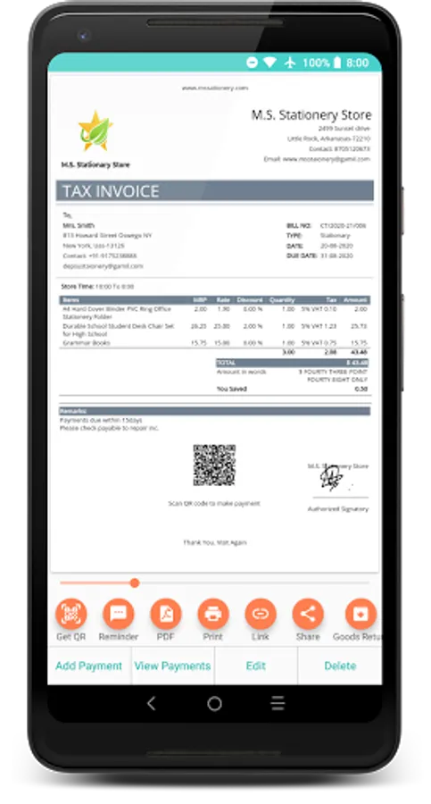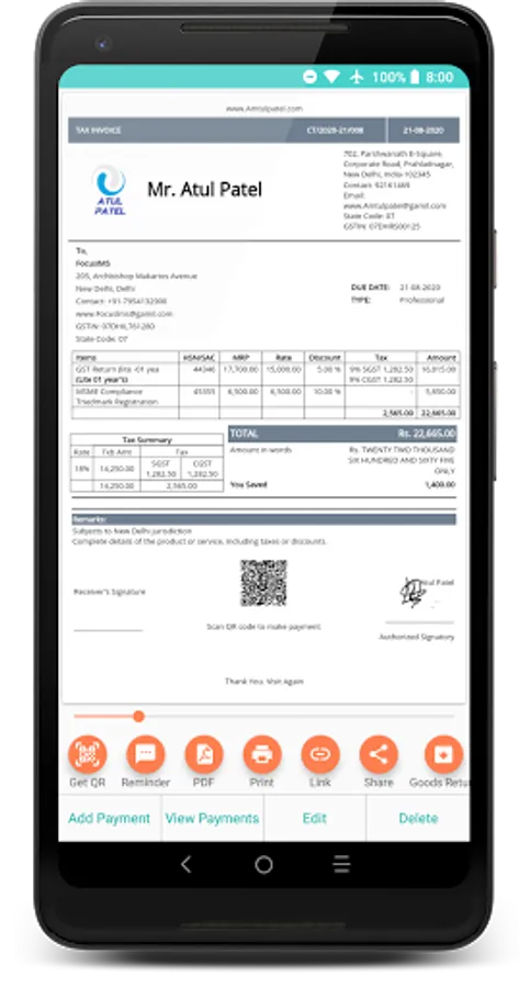 You can make professional Invoices in less than 8 seconds and Instantly share link to your invoice with your customer.