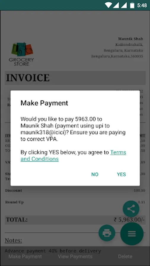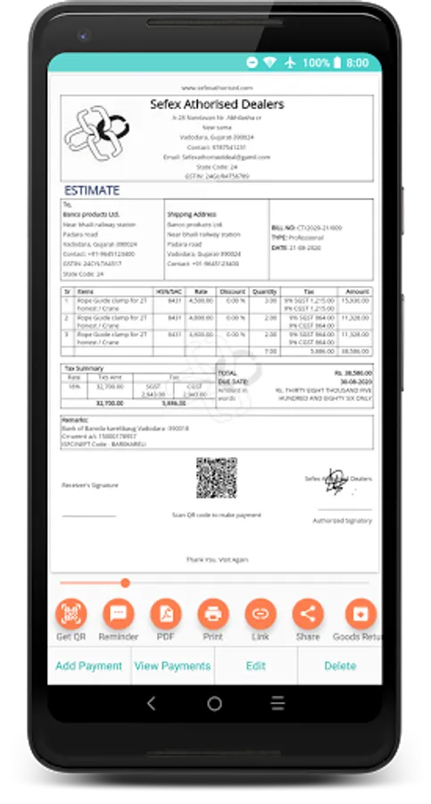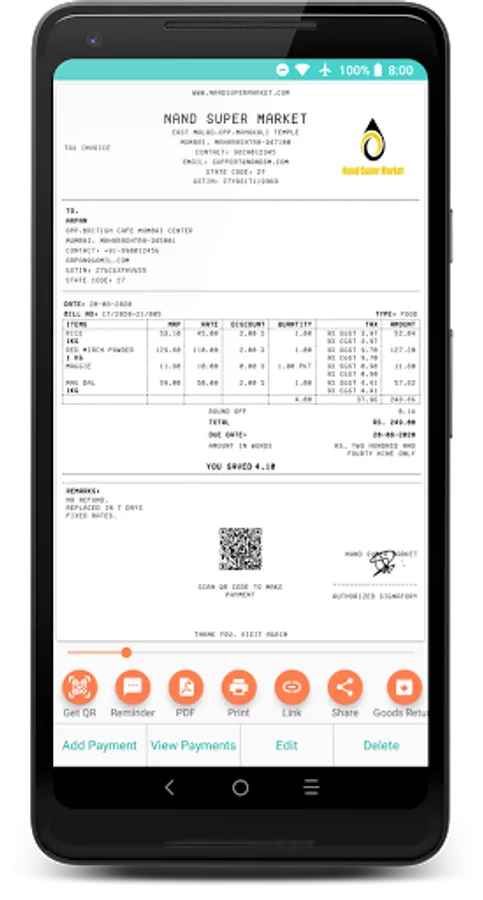 • Automatically share Invoice details to customer through SMS (Need to provide SMS permission)