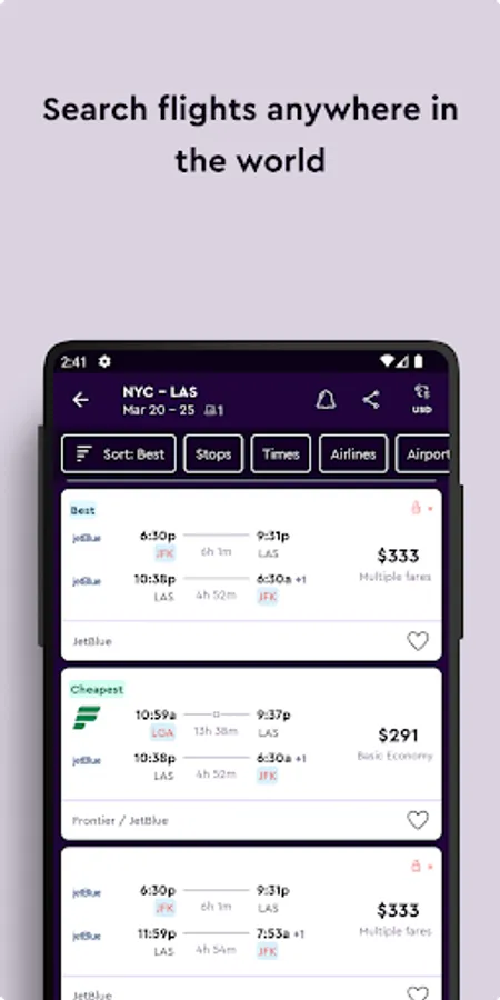 • Filter tickets quickly and easily by stops, departure or arrival time, airlines, airport, ticket type and travel site