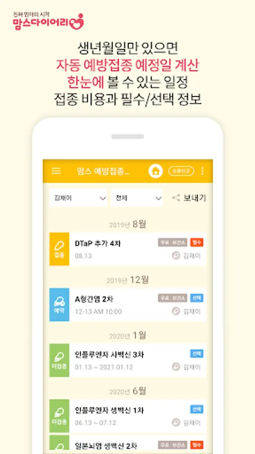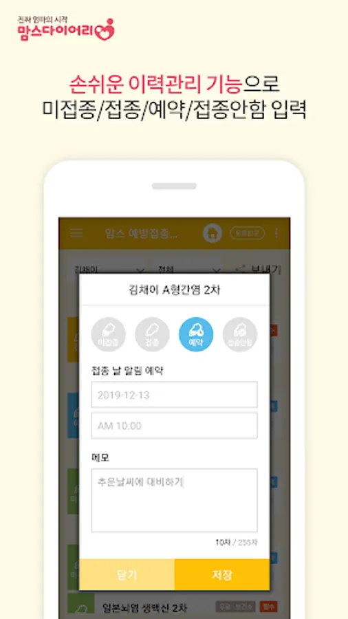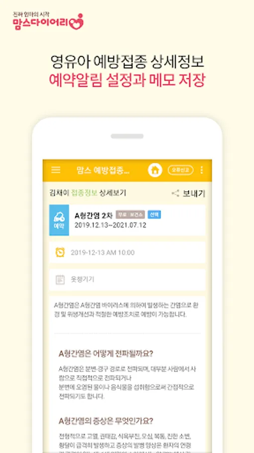 ◆ 신생아/영유아 예방접종 자동 날짜계산 및 알림, 이력관리 - 아기수첩
