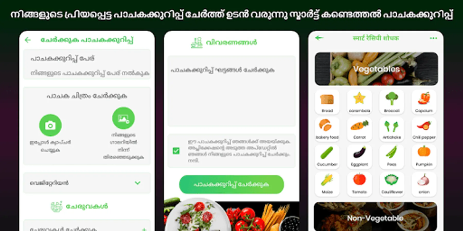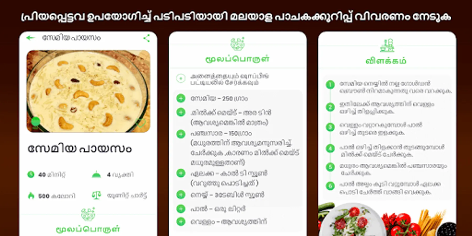 The app All Malayalam recipes Offline Food App Cook Book has many good features - like works in offline mode, the recipes can be easily bookmarked by using the favorite option, multiple sharing options, facility to search a particular recipe from all recipe tasty vegetarian recipes tasty non vegetarian.