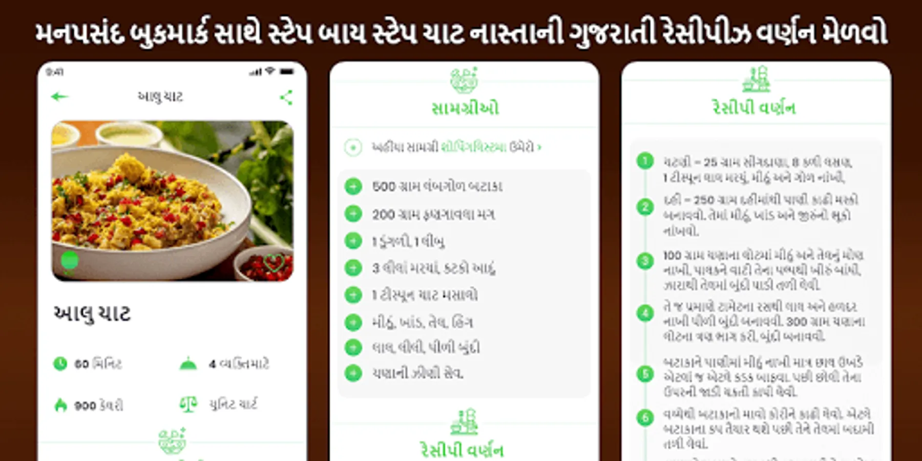 The app All Chaat Recipes gujarati Offline Quick and Easy Snacks Recipes gujarati has many good features - like works in offline mode, the recipes gujarati can be easily bookmarked by using the favorite option, multiple sharing options, facility to search a particular recipe from all recipe tasty vegetarian recipes gujarati tasty non vegetarian.