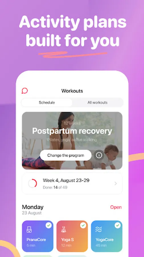 All the 15 programs include more than 500 daily workouts. They are all Gentle transformation through online woman workout. Prenatal yoga & workout with special yoga to prepare your body. Pregnancy yoga, pregnancy workouts for women according to your trimester where you will also find pregnancy exercises with a weight tracker. Postpartum or post pregnancy workout will help you lose pregnancy belly and get your own life back: a fit body, your female health and psychological comfort. This program provides you with various options to train your body such as kegel exercise, pilates workouts, and pelvic floor exercises. You will get the information on how to lose weight with special gentle and safe weight loss programs for women.