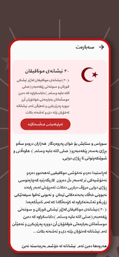 ﴿۳۰﴾نیشانەی مونافیقان لەژێر تیشکی قورئان و سوننەتی پێغەمبەر﴿صلی الله علیه وسلم ﴾داباسکراوە کە دەبێ موسڵمانان بەیارمەتی خواخۆیان ڵێ دوورە پەرێزبکرن و نەهێڵن ئەم نیشانانە لەخۆیان بێتە دی و تەشەنه بکات ..