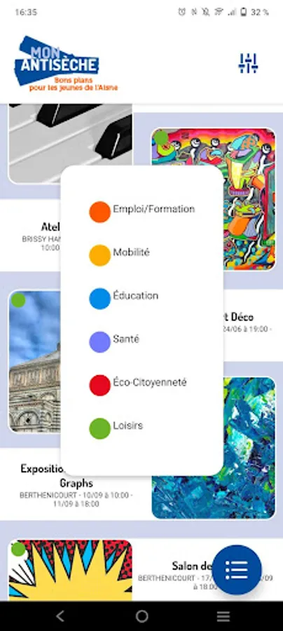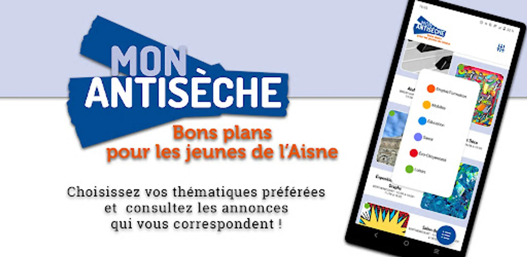 Whether in the fields of employment, training, education, mobility, health, eco-citizenship, leisure, this application aims to broadcast announcements of events taking place in the territory axonais and may be of interest to young people.