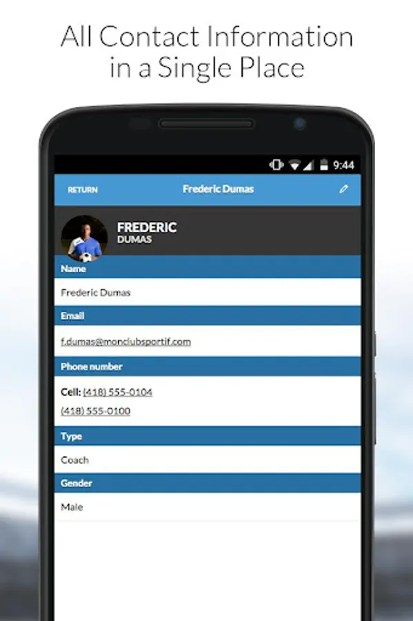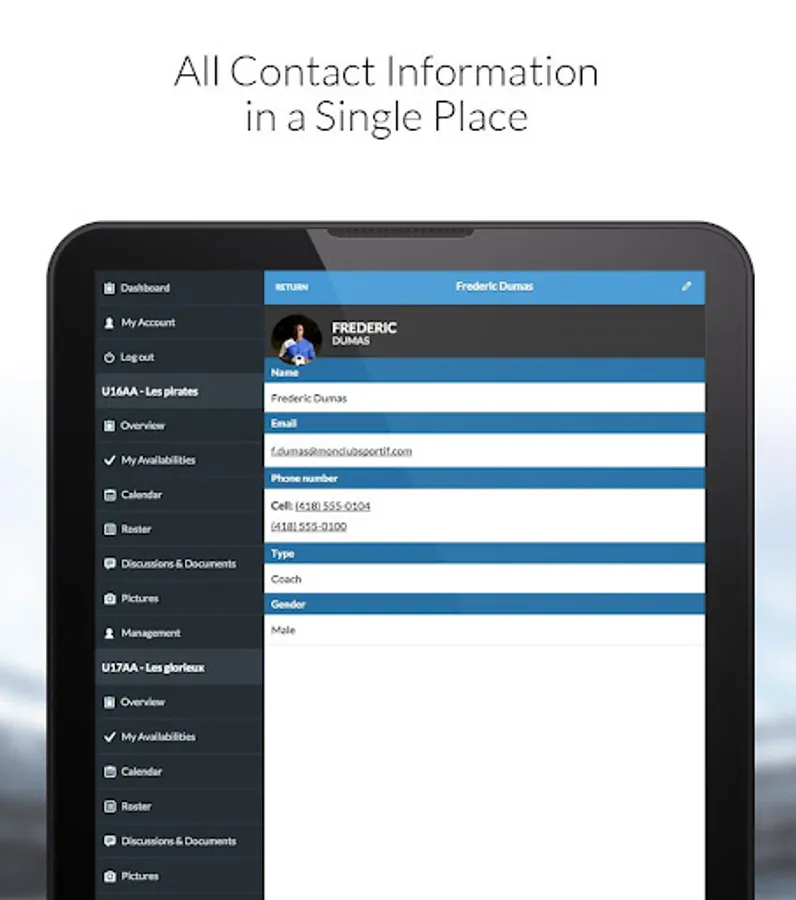 List of all members part of the team (players, coaches, managers) with their contact information (email, phone numbers, etc.).