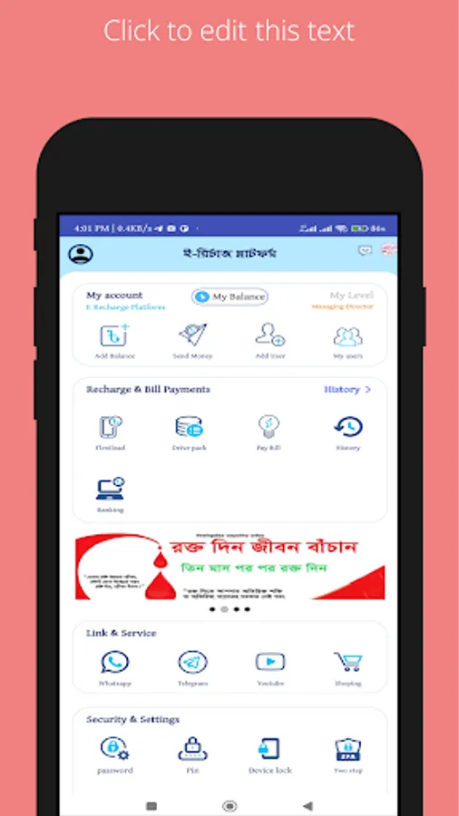 In our apps you can recharge, drive and even pay electricity bills. We have internet banking facilities. You can avail our facilities yourself. We have self registration and a commission based system