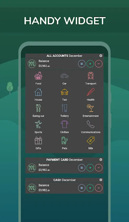 How do you manage your budget and watch every dollar? With Monefy, your financial organizer and finance tracker, it’s simple. Each time you buy a coffee, pay a bill, or make a daily purchase, you only need to add each expense you have — that's it! Just add new records each time you make a purchase. It’s done in one click, so you don’t need to fill anything except the amount. Tracking daily purchases, bills, and everything else you spend money on has never been so quick and enjoyable with this money manager.