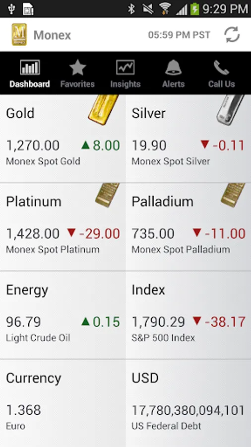 Investors gain live bullion and coin prices from America's largest two-way market, Monex, along with important market indicators, indexes, insights, charts, and ratios for gold, silver, platinum, palladium and oil. A market summary Dashboard, your Favorites and price Alerts may be personalized by you to your individual preference. Use the intriguing National Debt Clock, Money Supply projections and the Gold Valuation according to Reserves to Money Supply for a timely conceptual perspective of the state of USA fiscal affairs.