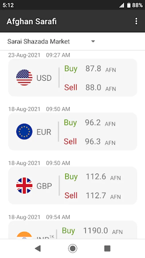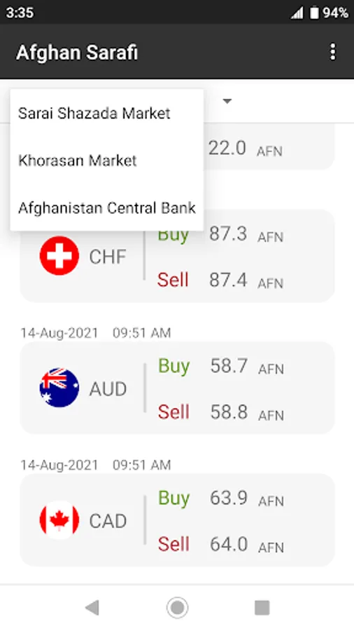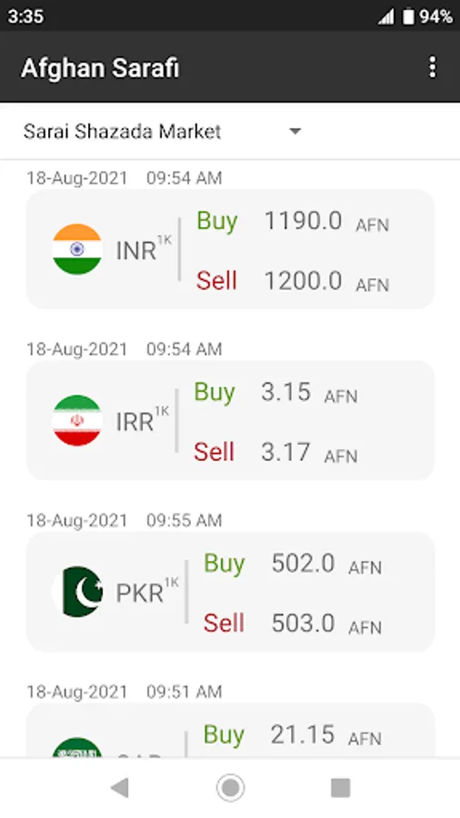 Afghan Sarafi gives you exchange rates of all major currencies available in Afghanistan. Currencies available are USD, EUR, GBP, IRR, INR, PKR, SAR, RUB, etc. Exchange rates are from three sources Sarai Shazada market in Kabul, Khorasan market in Herat, and Afghanistan Central Bank (Da Afghanistan Bank).