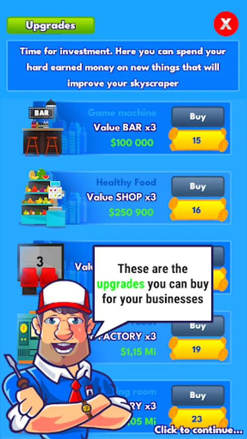 ★ Use your earnings from tapping (as well as from your managers) to upgrade various businesses.