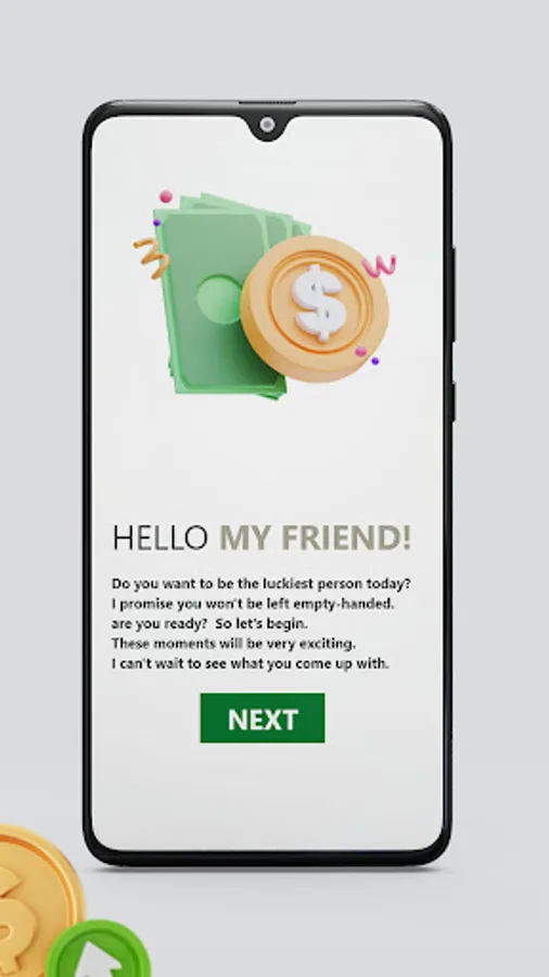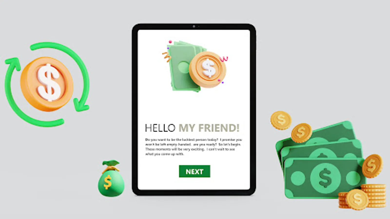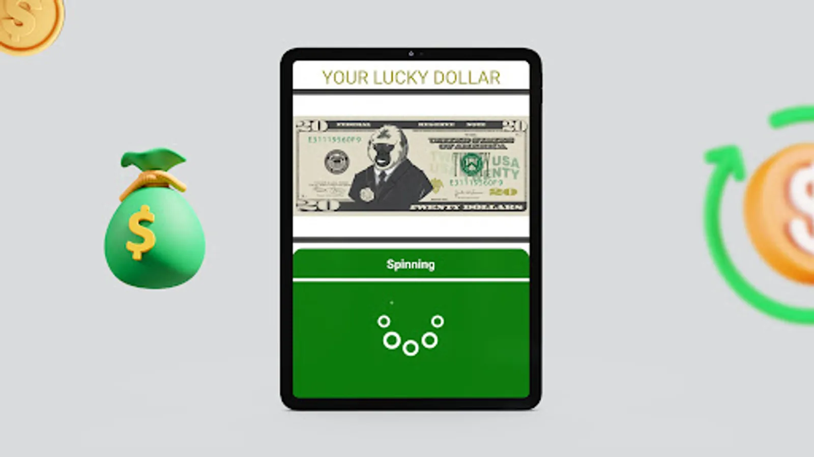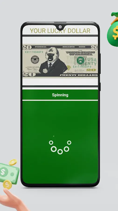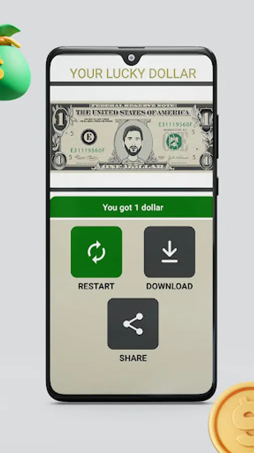 This app is a entertainment game. You will win randomly a dollar sticker. Stickers will be 1,5,10,20,50 and 100 dollars with different design. You will be able to share it with your friend and download it to your phone. Please be aware of that when you download or share your sticker the game will be ended. You can restart the game if you don't download or share.