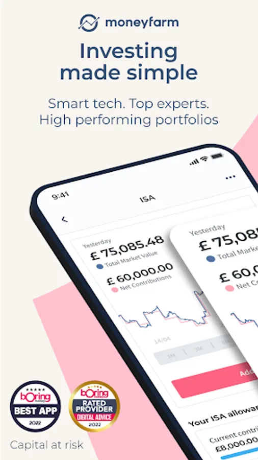 Our award-winning Moneyfarm investment app offers cost-efficient investments at the touch of a button, complete visibility of your investment account right in the app and an investment consultant at the end of the phone whenever you’d like to talk.
