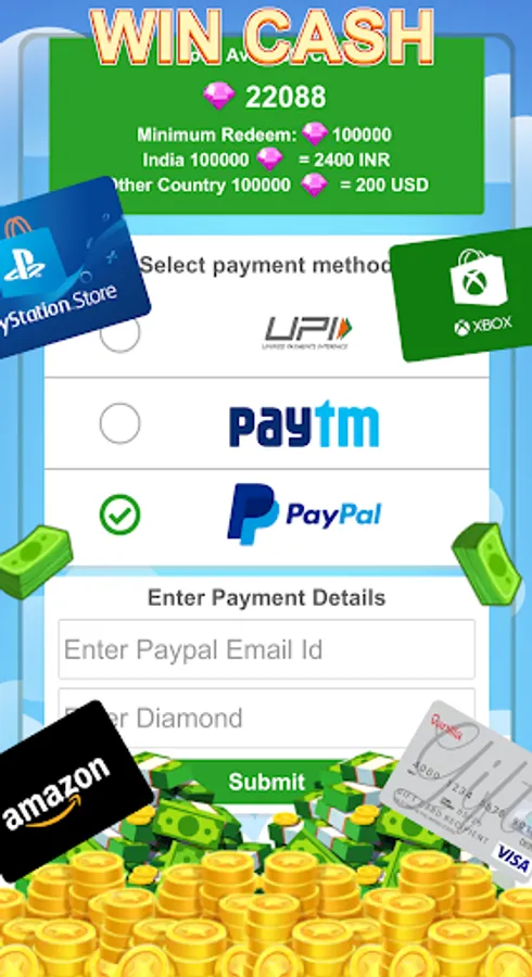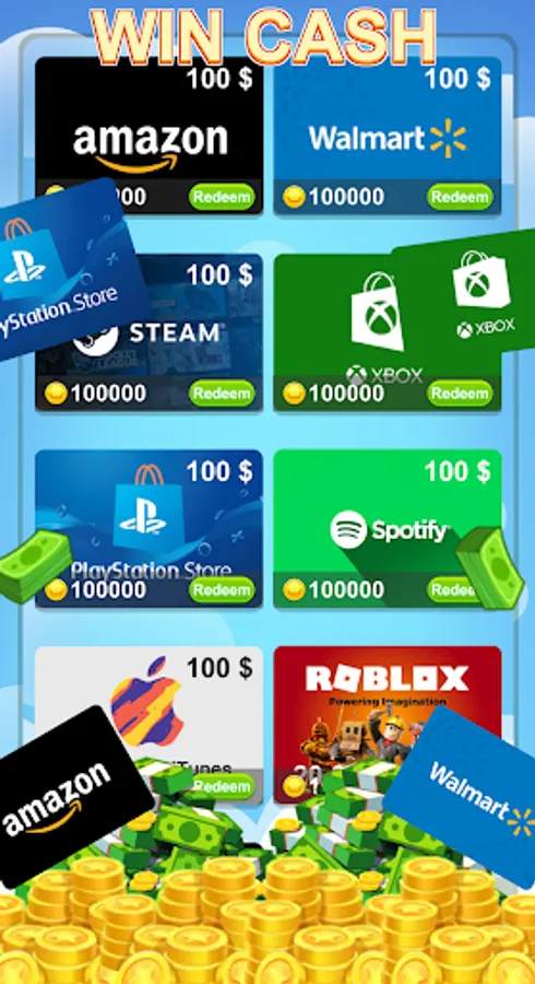 Earn money on Real Cash games and get free gift cards when you play this game. The more you play, the more you earn. You can get free Paypal cash, Paytm Cash, Amazon Pay Cash, Flipkart Gift cards and Google Play Gift cards, Spotify membership, Netflix subscription, Amazon Gift cards and more! 🤑
