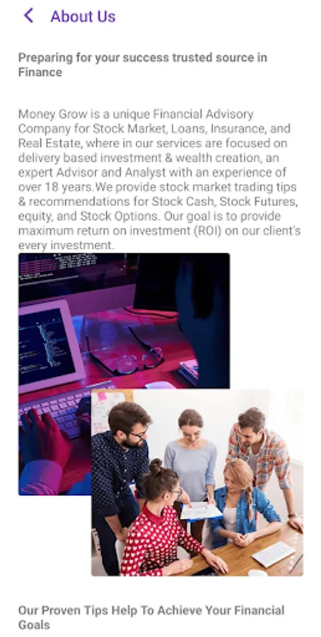Money Grow is a unique Financial Advisory Company for Stock Market, Loans, Insurance, and Real Estate, where in our services are focused on delivery based investment & wealth creation, an expert Advisor and Analyst with an experience of over 18 years.We provide stock market trading tips & recommendations for Stock Cash, Stock Futures, equity, and Stock Options. Our goal is to provide maximum return on investment (ROI) on our client's every investment.
