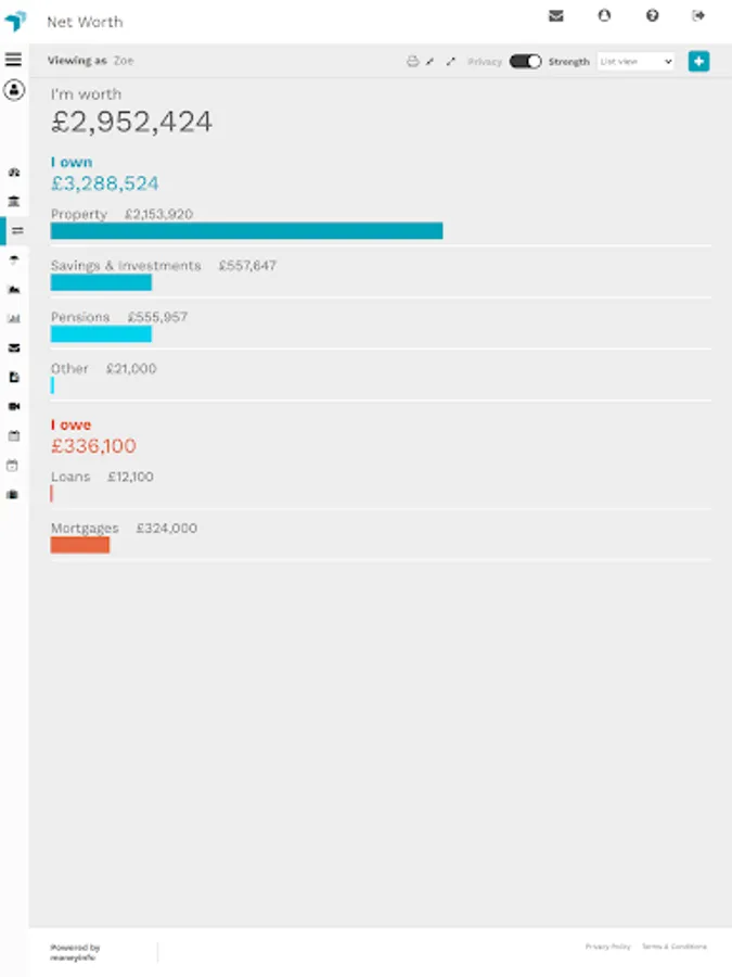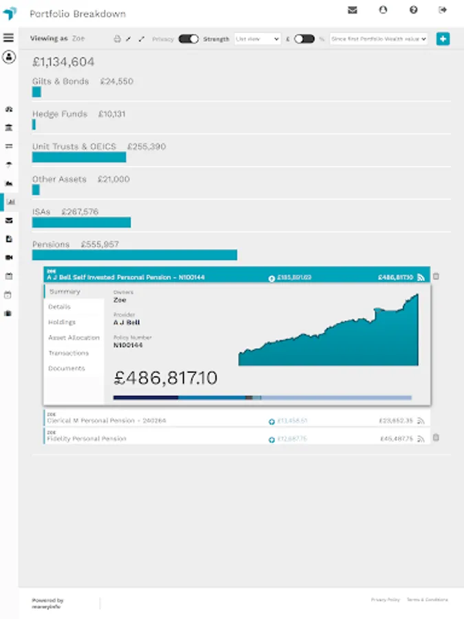 Think of it as your digital financial filing cabinet. All of your investments, savings, pensions, insurances, banking, credit cards and property can be tracked together with all of the associated paperwork.