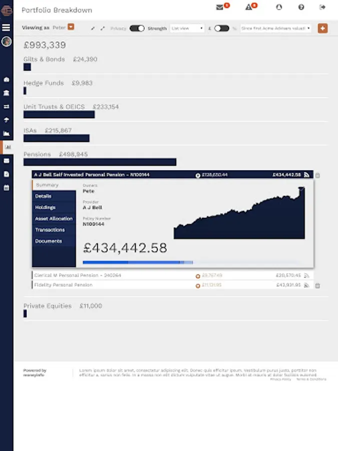 Think of it as your digital financial filing cabinet. All of your investments, savings, pensions, insurances, banking, credit cards and property can be tracked together with all of the associated paperwork.